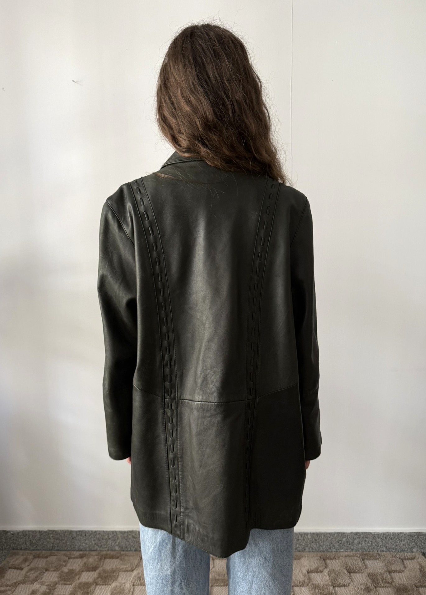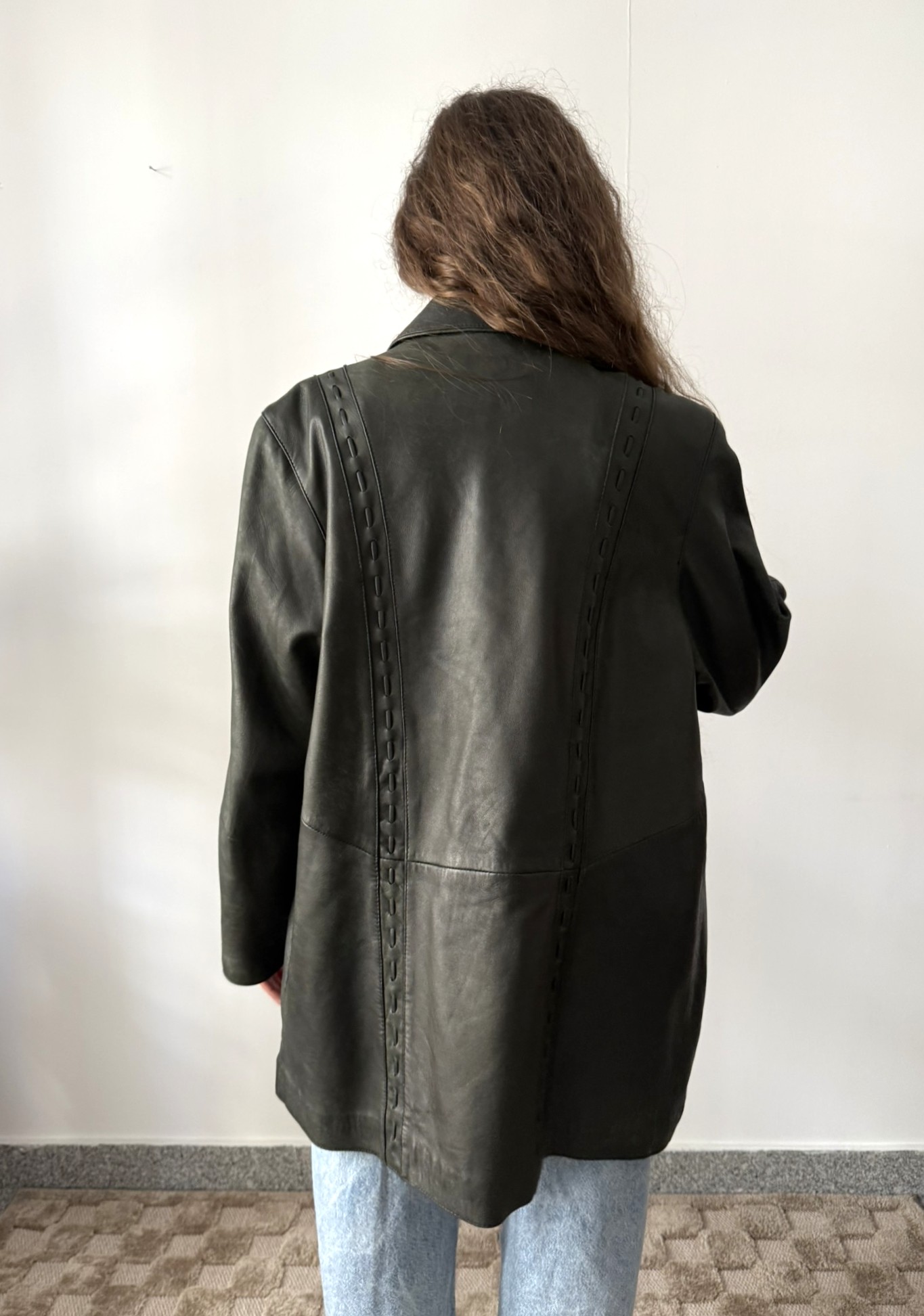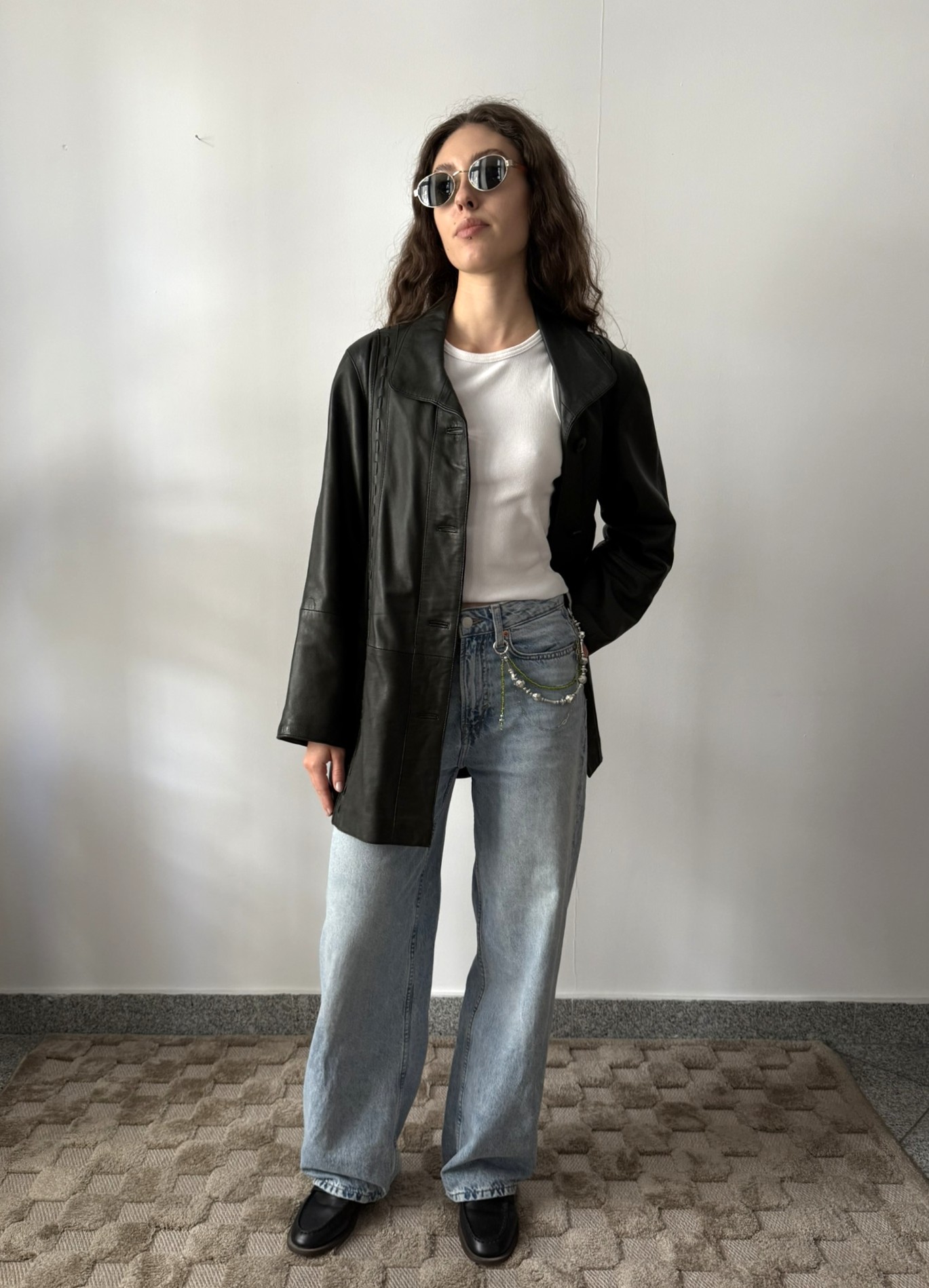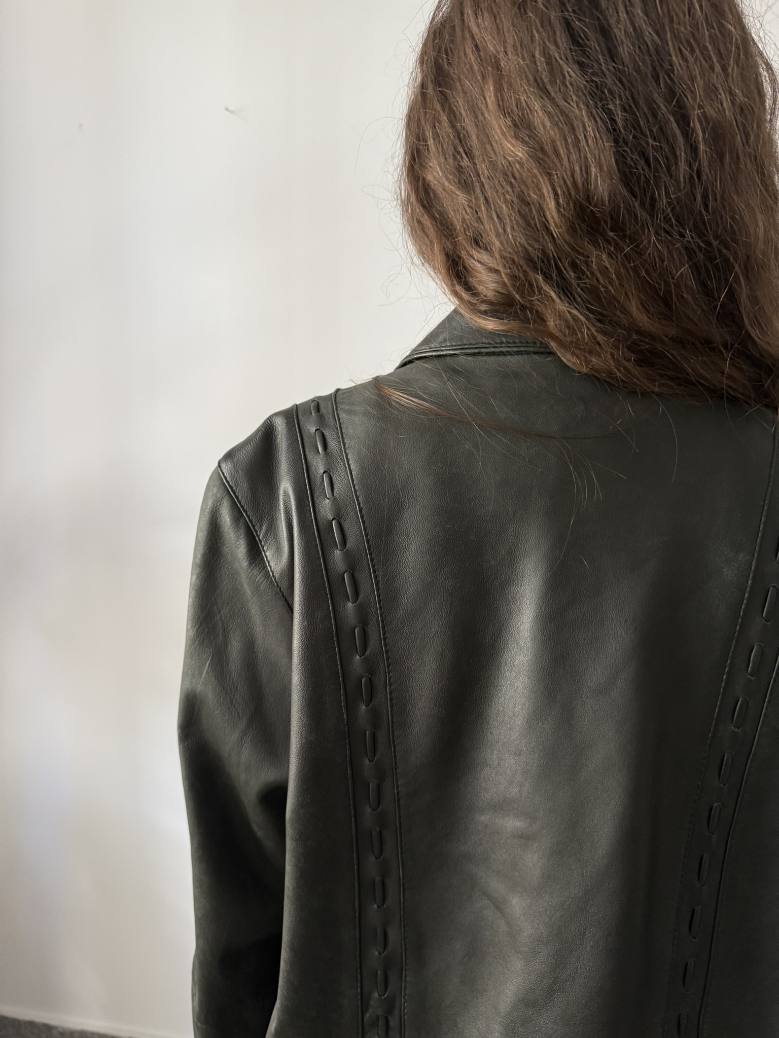 Kurtka posiada delikatne przetarcia skóry co dodaje jej dodatkowego vintage vibu