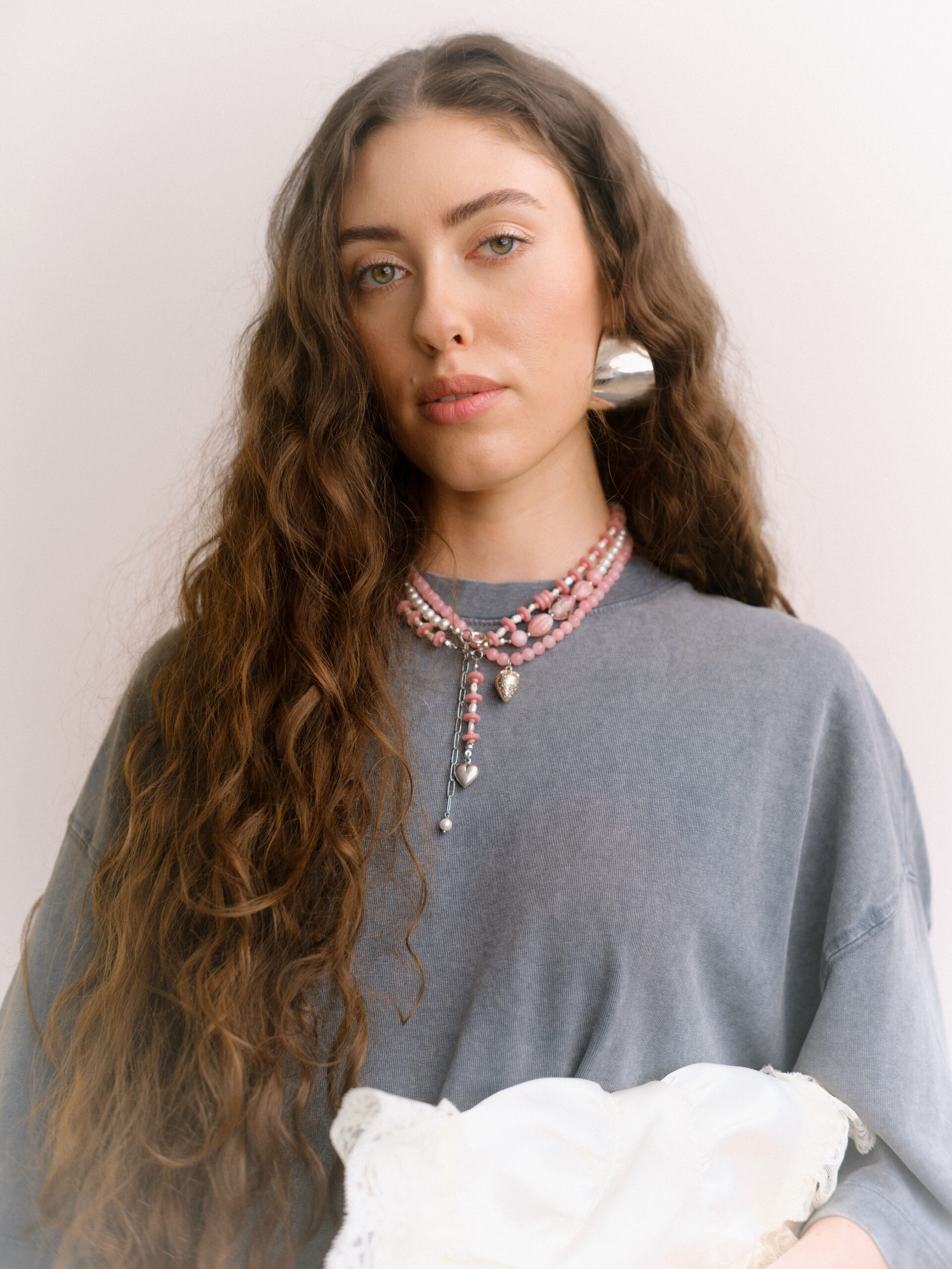 Naszyjnik z różowych koralików i naturalnych pereł z vintage zawieszką Serce