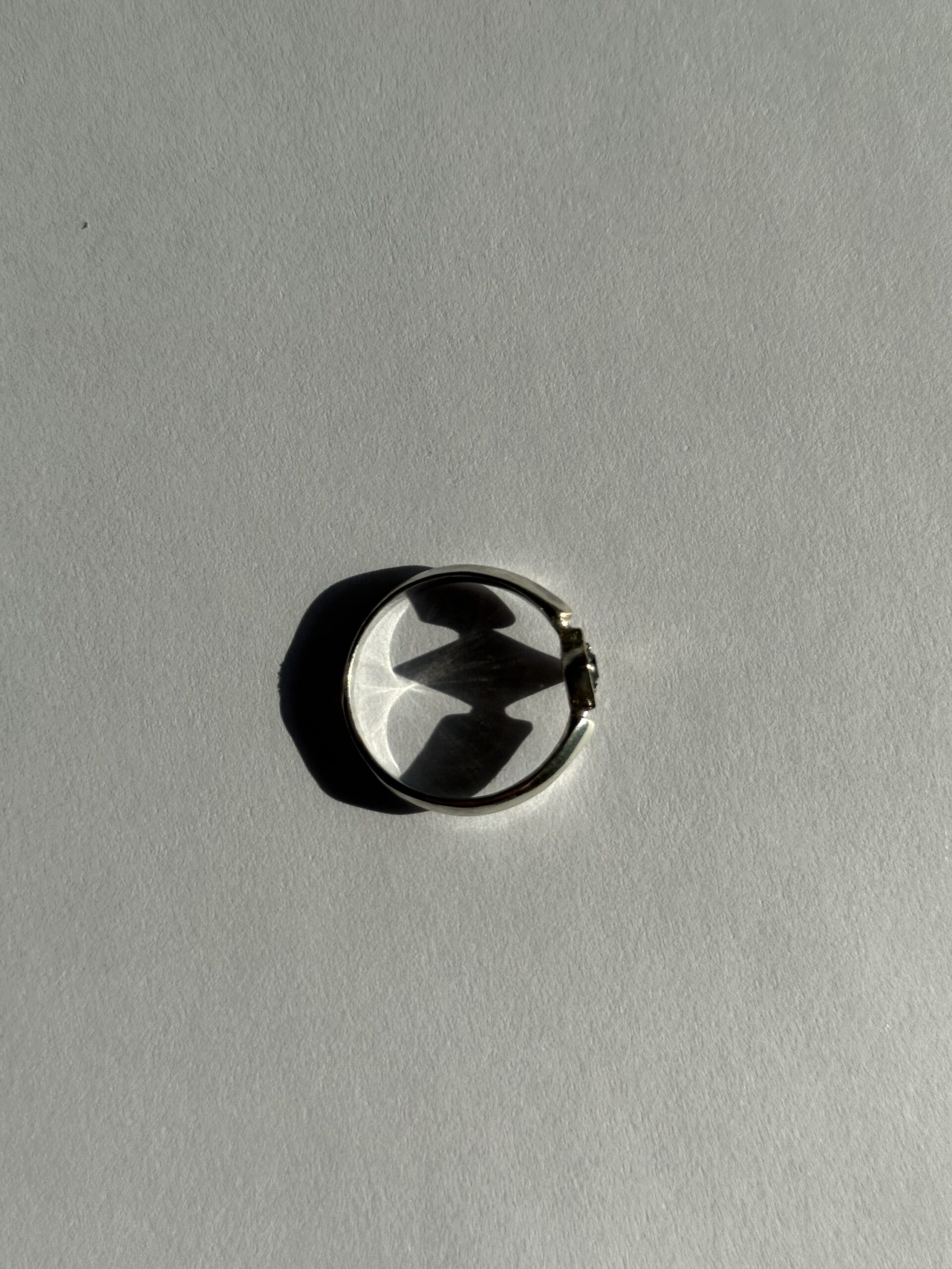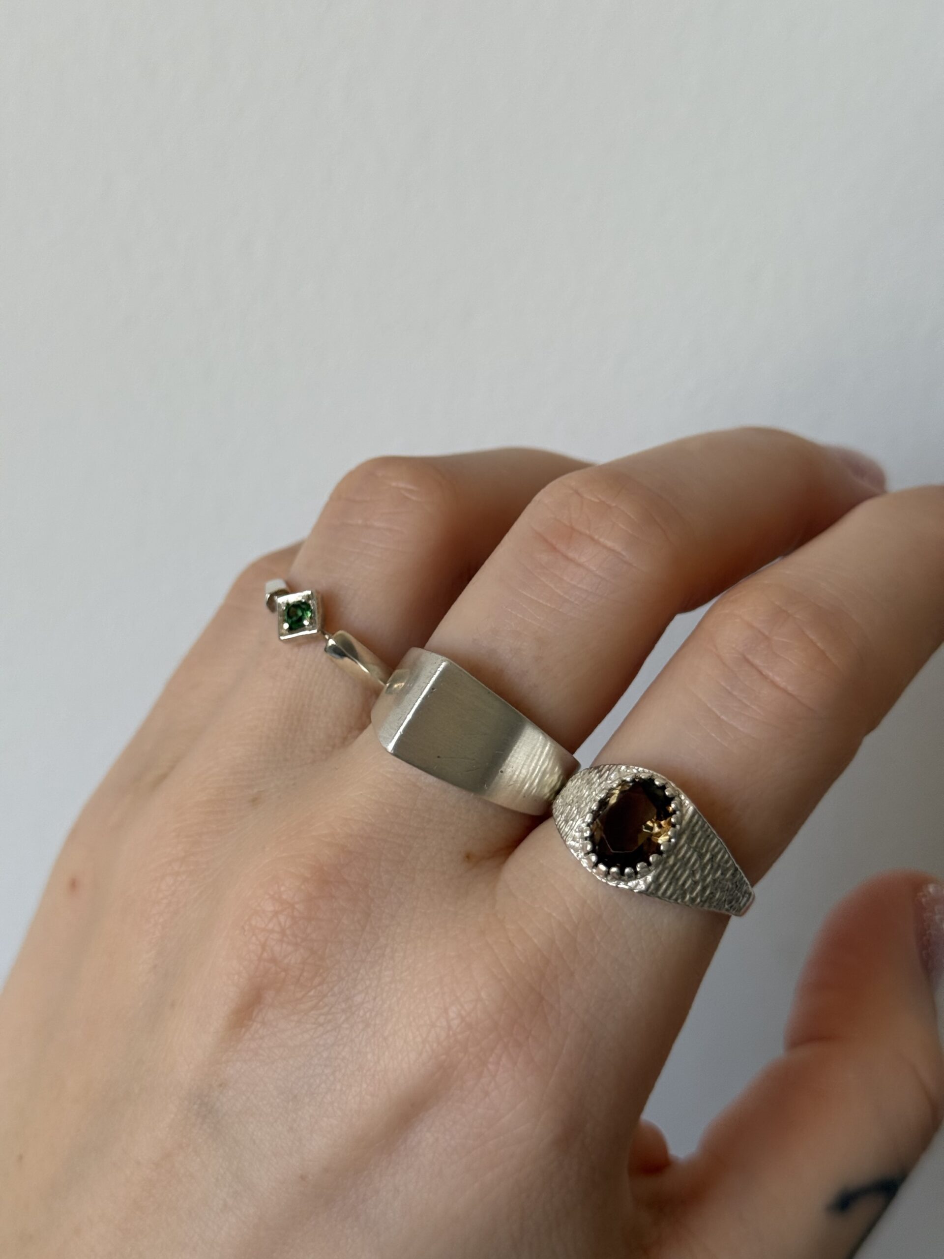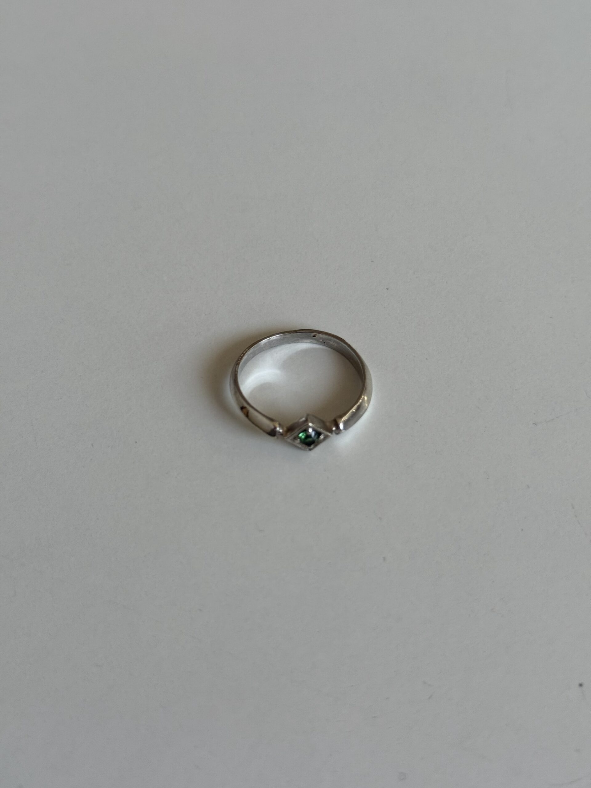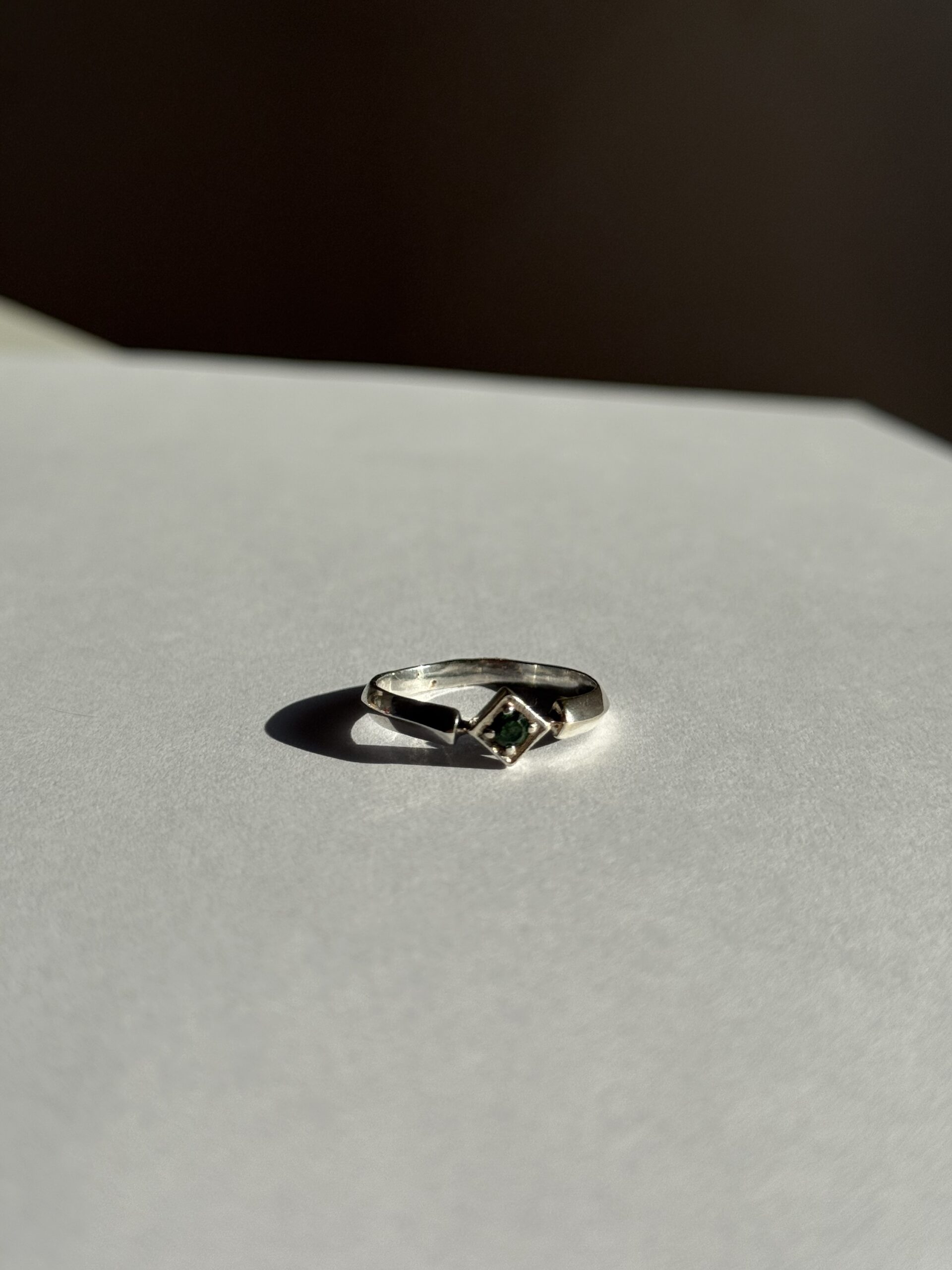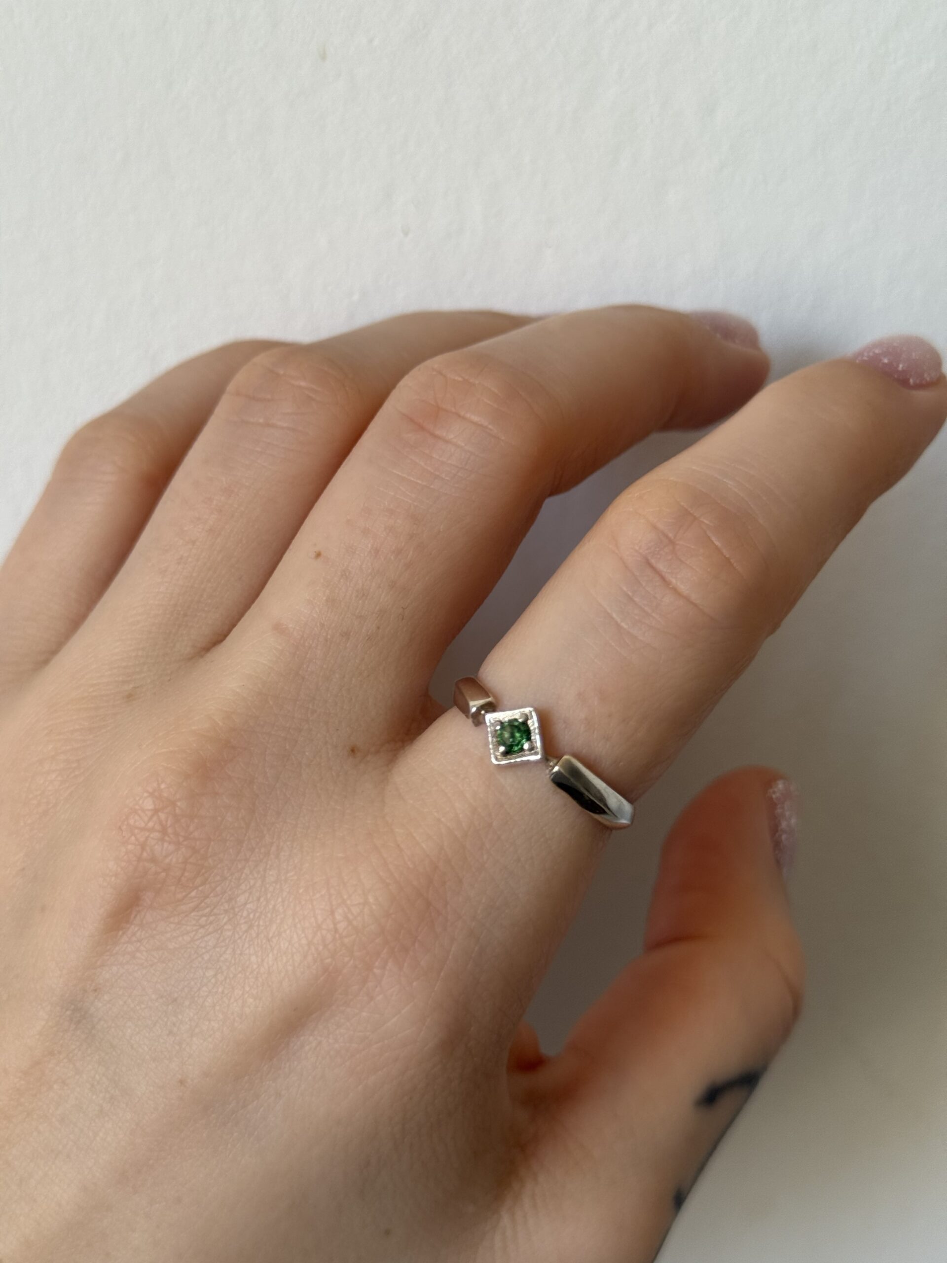 Pierścionek o geometrycznym kształcie zdobiony diopsydem lub zieloną cyrkonią.